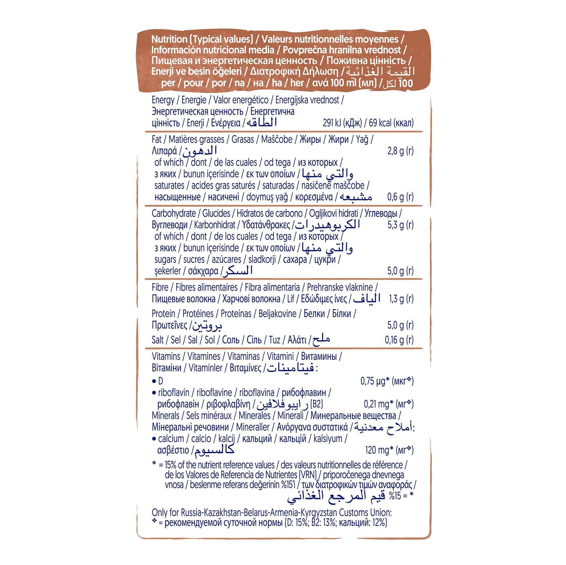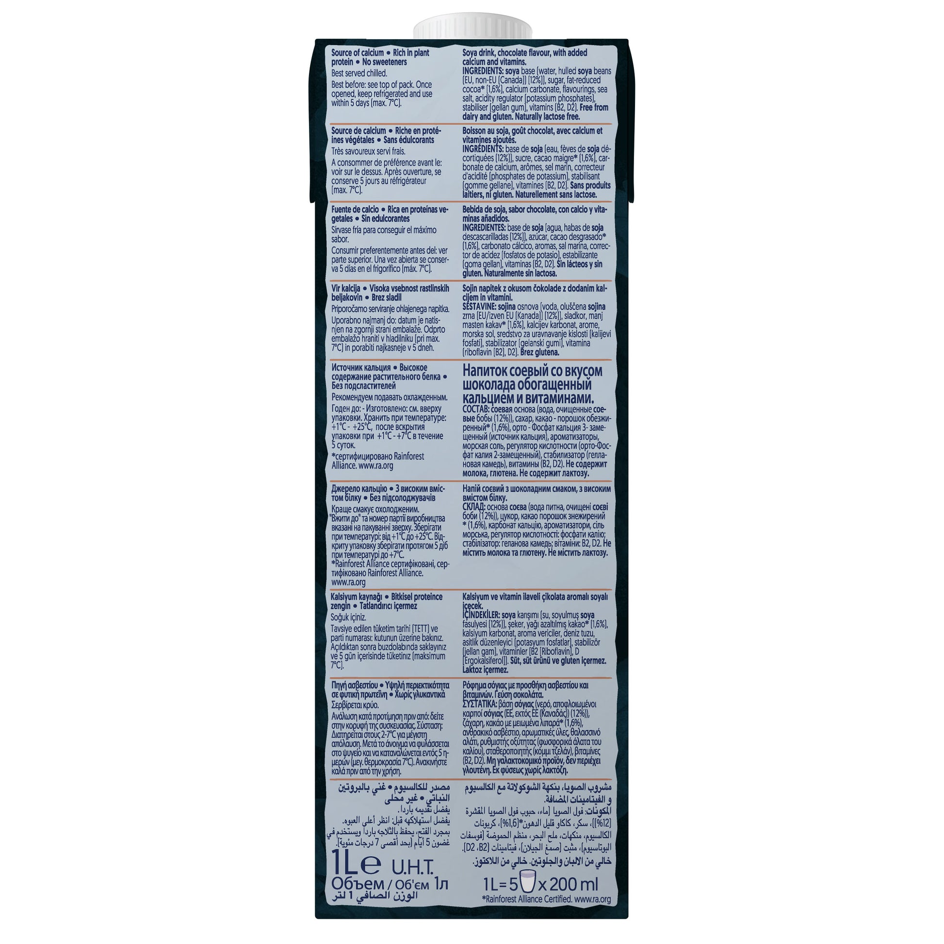Soya base (92,9%) (Water, Hulled soya beans (12%)), Sugar, Fat-reduced cocoa* (1.6%), Calcium (Calcium carbonate), Flavouring, Sea salt, Acidity regulator (Potassium phosphates), Stabiliser (Gellan gum), Vitamins (B2, D2)