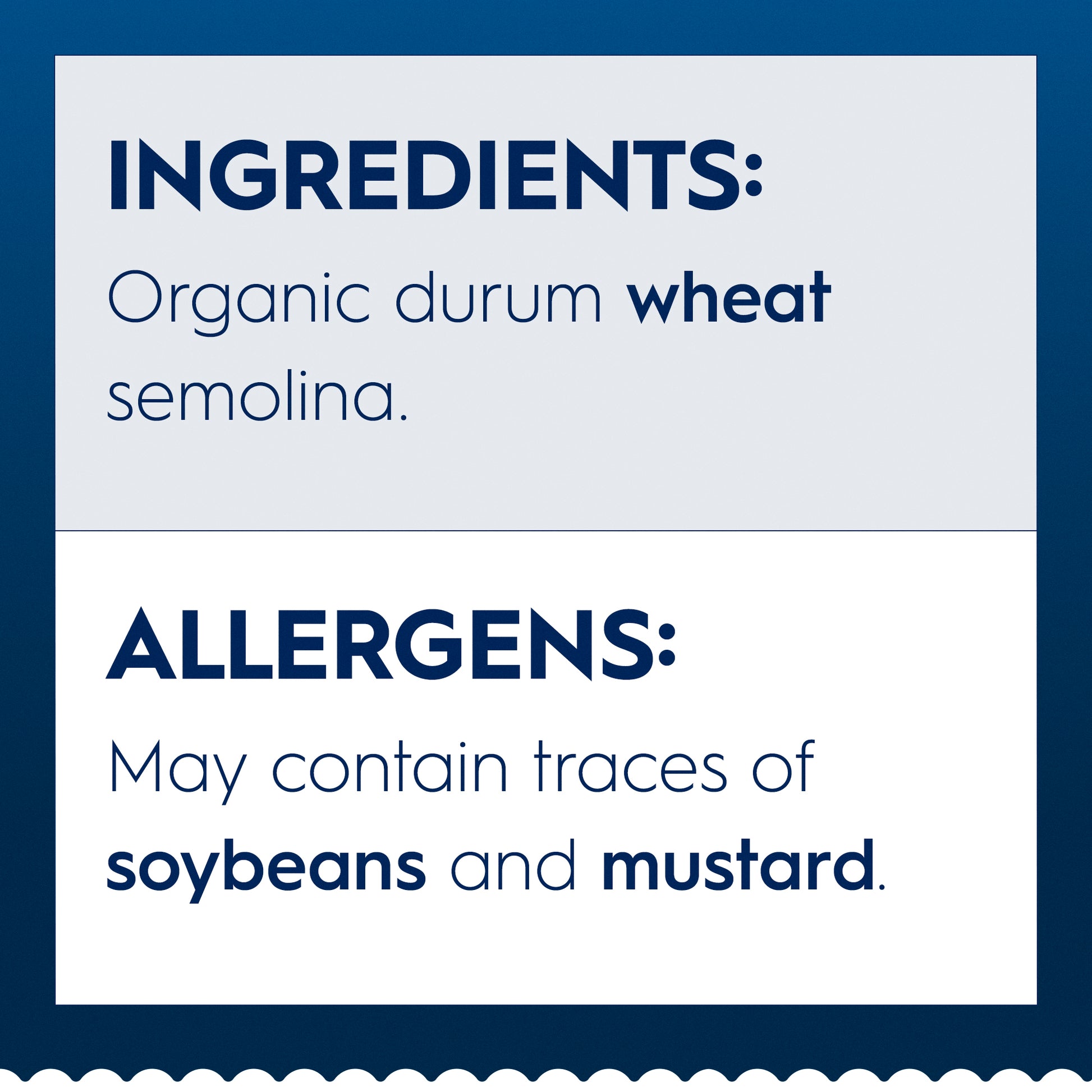 Organic durum wheat semolina, water. May contain traces of soybeans and mustard.