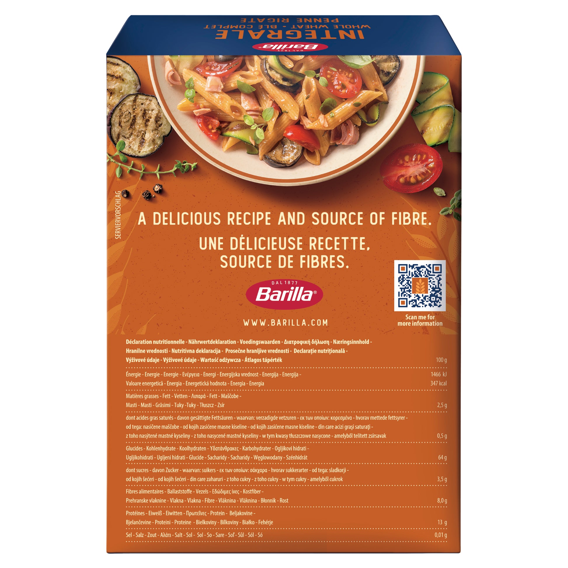 Barilla WHOLE WHEAT PENNE RIGATE, with a small diameter and natural source of fiber, are characterized by their proverbial ability to retain the sauce. Thanks to their small size, they blend perfectly with the sauce, while the rich external grooves know how to generously accommodate the ingredients. Combine the Whole meal Penne Rigate with a sauce of cuttlefish, shrimp and peas, for a first course with a refined taste and delicate colors.