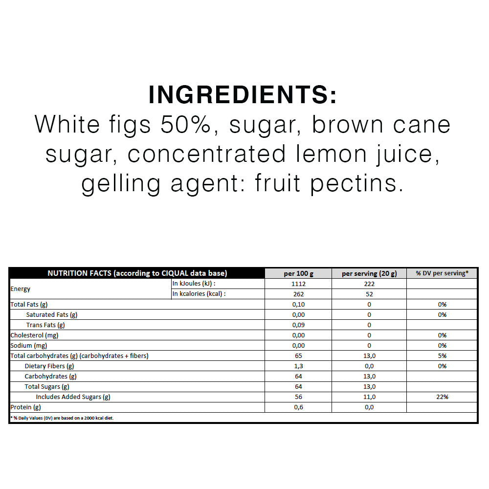 Figs● Sugar● Brown Cane Sugar● Concentrated Lemon Juice● Gelling Agent: Fruit Pectin● Prepared with 50g of Figs per 100g● Total Sugar content: 60g per 100g