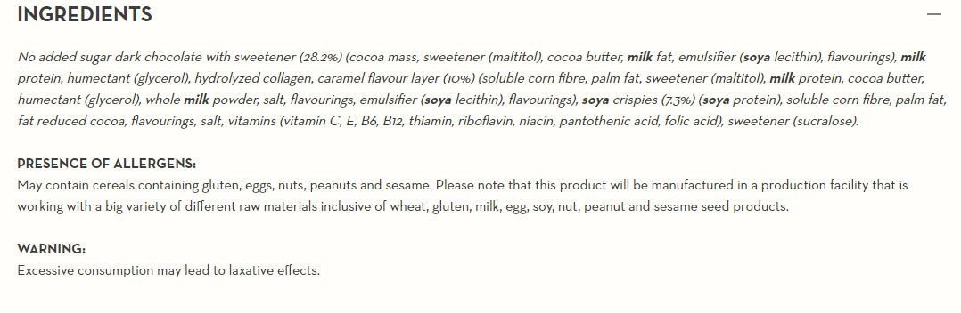 Ingredients: No added sugar dark chocolate with sweetener (28,2%) (cocoa mass, sweetener [maltitol], cocoa butter, milk fat, emulsifier [soya lecithin], flavourings), milk protein, humectant (glycerol), hydrolyzed collagen, caramel flavour layer (10%) (soluble corn fibre, palm fat, sweetener [maltitol], milk protein, cocoa butter, humectant [glycerol], whole milk powder, salt, flavourings, emulsifier [soya lecithin], flavourings), soya crispies (7,3%) (soya protein), soluble corn fibre, palm fat, fat reduced cocoa, flavourings, salt, vitamins (vitamin C, E, B6, B12, thiamin, riboflavin, niacin, pantothenic acid, folic acid), sweetener (sucralose). May contain gluten-containing cereals, eggs, nuts, peanuts and sesame seeds.