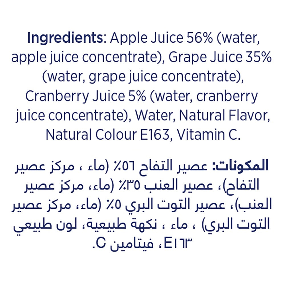 Ingredients: Apple Juice 56% (water, apple juice concentrate), Grape Juice 35% (water, grape juice concentrate), Cranberry Juice 5% (water, cranberry juice concentrate), Water, Natural Flavor, Natural Color E163, Vitamin C.
