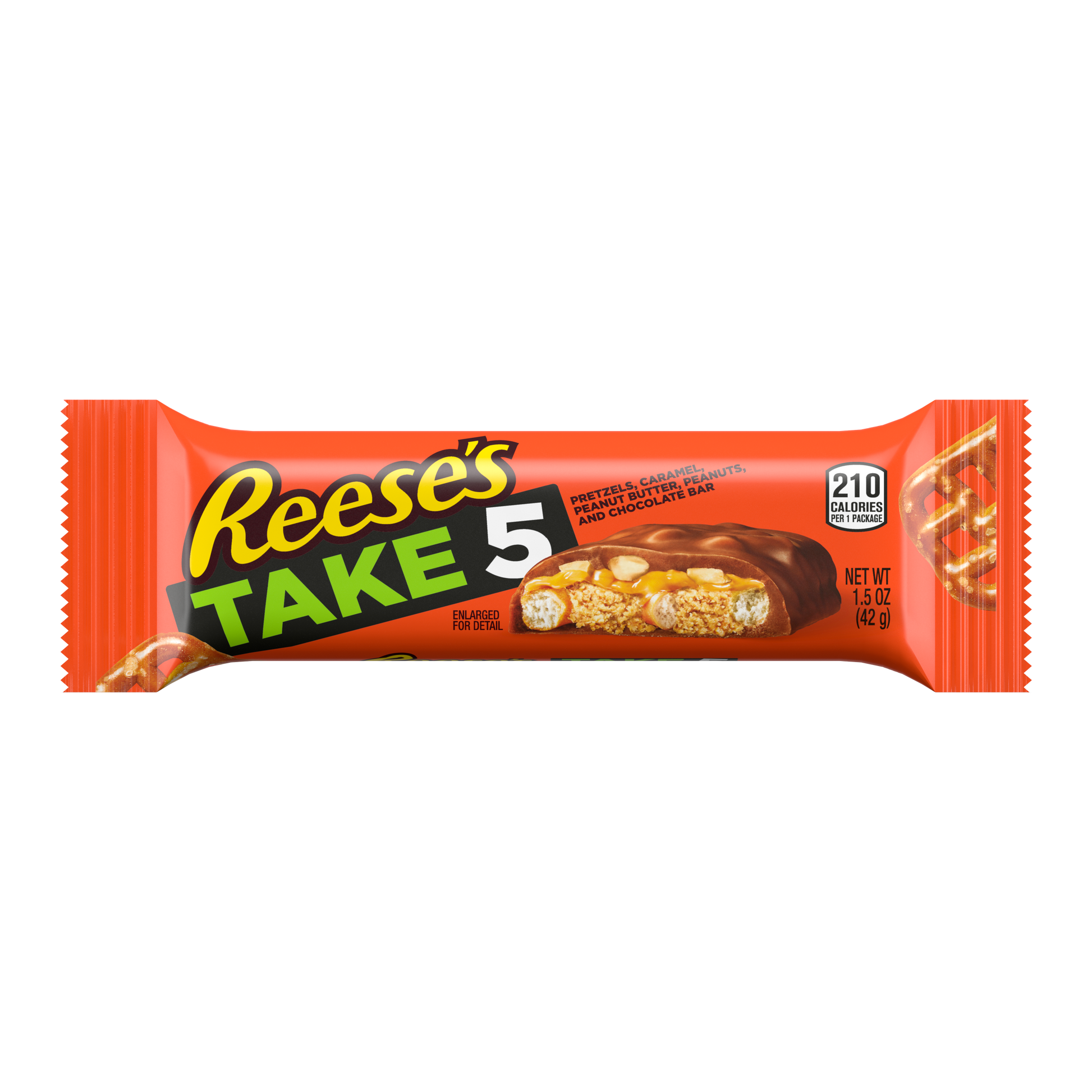 The TAKE 5 Bar is five layers of sweet and salty goodness that doesn’t ask you to compromise. It’s crunchy pretzels, smooth peanut butter, salty peanuts and sweet caramel—all covered in a chocolaty coating. Grab this snack the next time you want to mix things up.