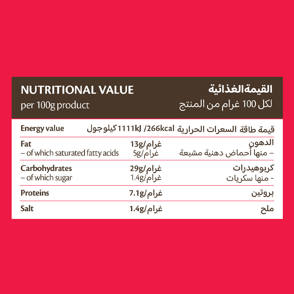 Wheat flour, water, refined oils (palm oil, rapseed oil, cottonseed oil and sunflower oil) in varying propotiions; cornstarch, salt, olive oil (1.3%), sugar, flour treatment agent:L-cysteine, ascorbic acid; enymes; coloring agent: carotenes flovors; butter flavoring. Filling: cheese curd (36%) [pasteurized whey], water, cow's milk white brined cheese (15%) [pasteurized cow's milk, salt, lactic culture, firming agent: calcium chloride; microbial rennet], feta cheese (10%) [pasteurized sheep's milk, pasteurized goat's milk, salt lactic culture, microbial rennet wheat semolina, emulsifier;cellulose, sodium carbxymethylcellulose, milk protein, margarine (refined sunflower oil, re-esterified palm oil, water, refined palm oil, salt, emulsifiers: mono- and diglycerides of fatty acids, soy lecithin preservative: potassium sorbate; acidity regulator:citirc acid; butter flavoring, coloring agent:carotenes; antioxidant: alpha-tocopherol], salt.