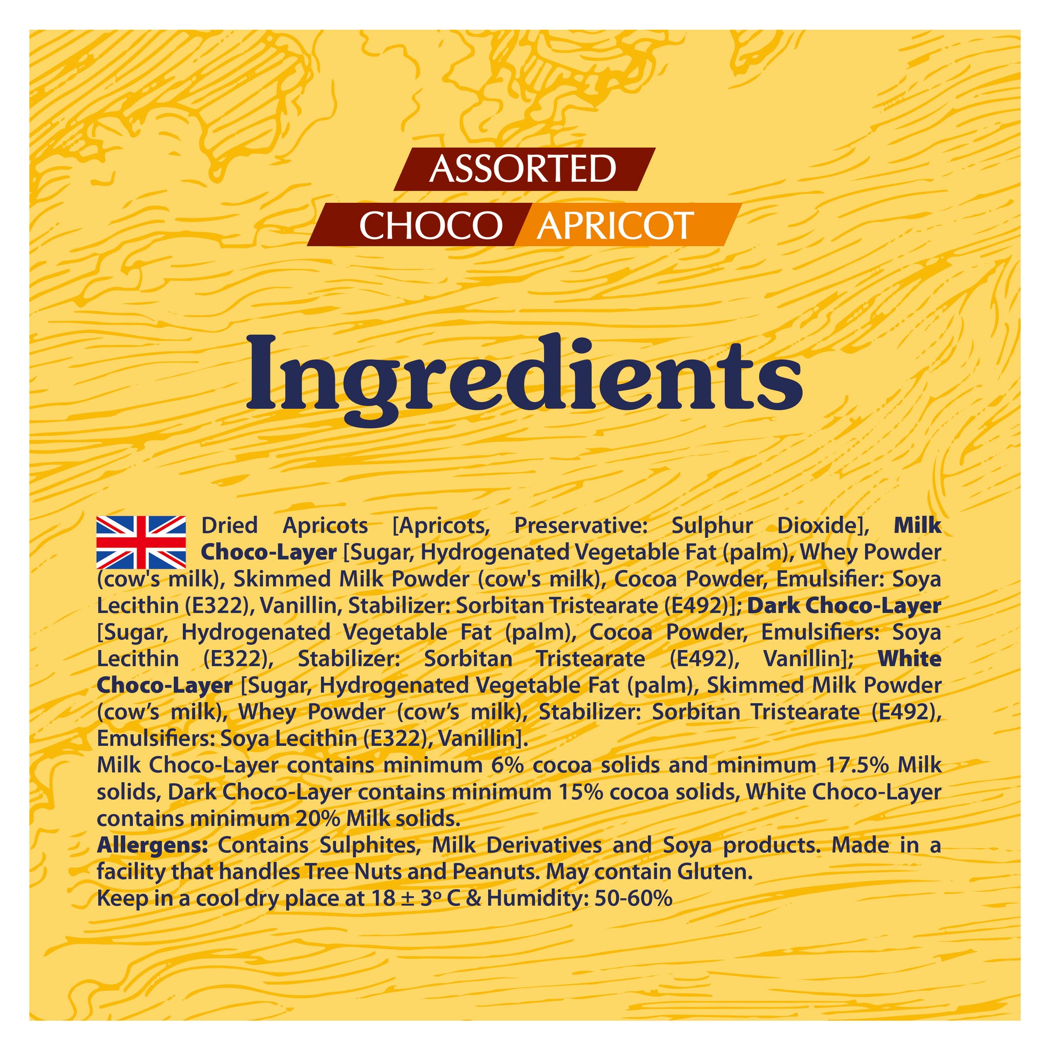- PRODUCT SPECIFICATIONS: Arabian Delights Chocodate with Apricots pack contains has classic chocolate flavor.