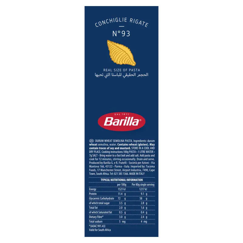 Barilla CONCHIGLIE RIGATE represent one of the most popular formats on tables all over the world. This majestic-looking format is extremely versatile and lends itself to any preparation, giving its best with all simple or rich sauces. If you are looking for a tasty recipe, try them with broccoli and sausage.