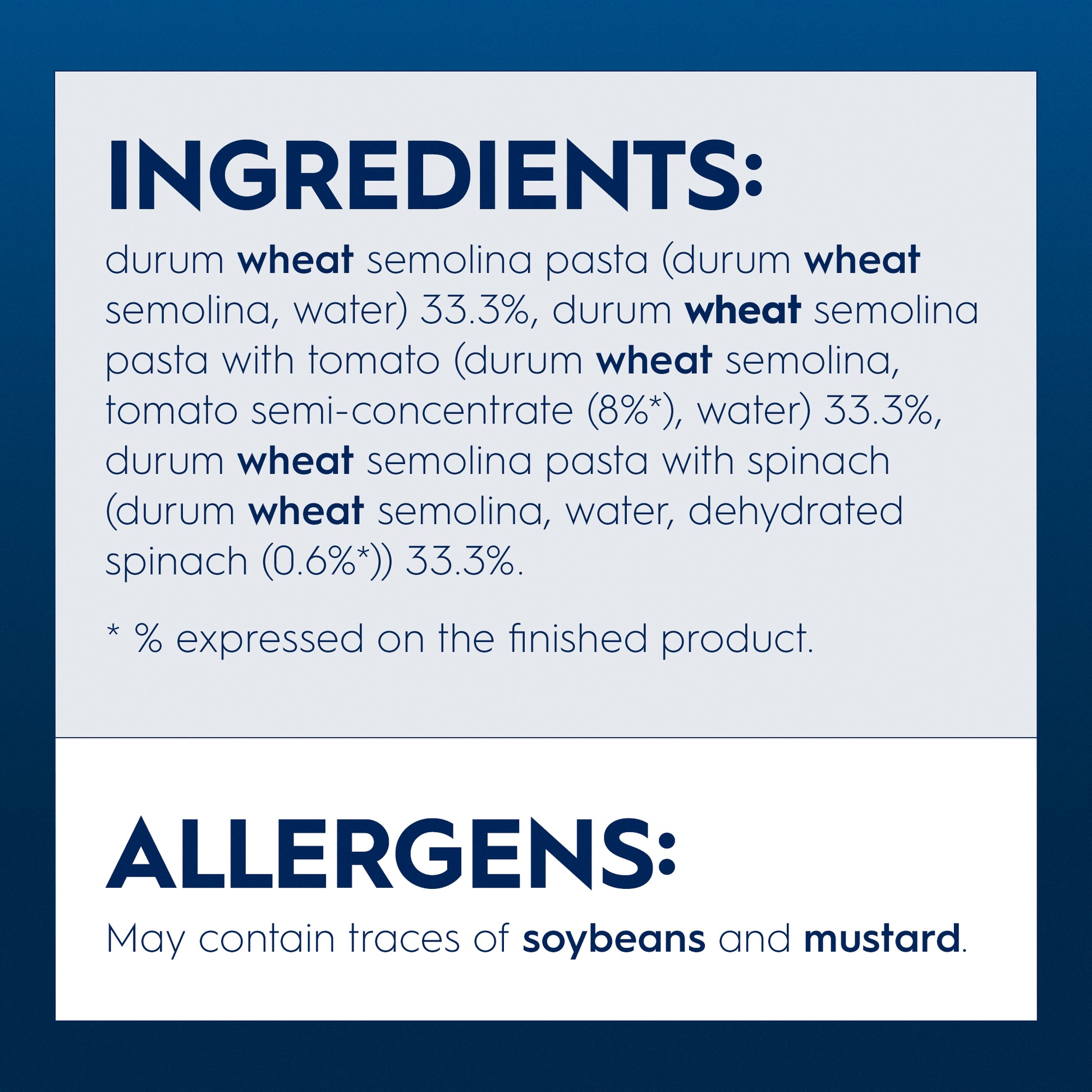 Durum Wheat Semolina Pasta (Durum Wheat Semolina, Water) 33.3%, Durum Wheat Semolina Pasta with Tomato (Durum Wheat Semolina, Tomato Concentrate (8%), Water) 33.3%, Durum Wheat Semolina Pasta with Spinach (Durum Wheat Semolina, Water, Dehydrated Spinach (0.6%)) 33.3%. May be present: Soy