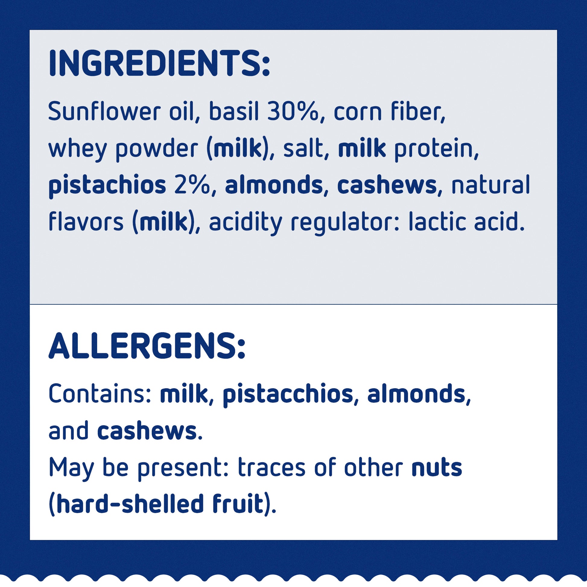 Ingredients: sunflower oil, basil 30%, corn fiber, whey powder, salt, milk proteins, pistachios 2%, almonds, cashews, natural flavors (milk), acidity regulator: lactic acid.