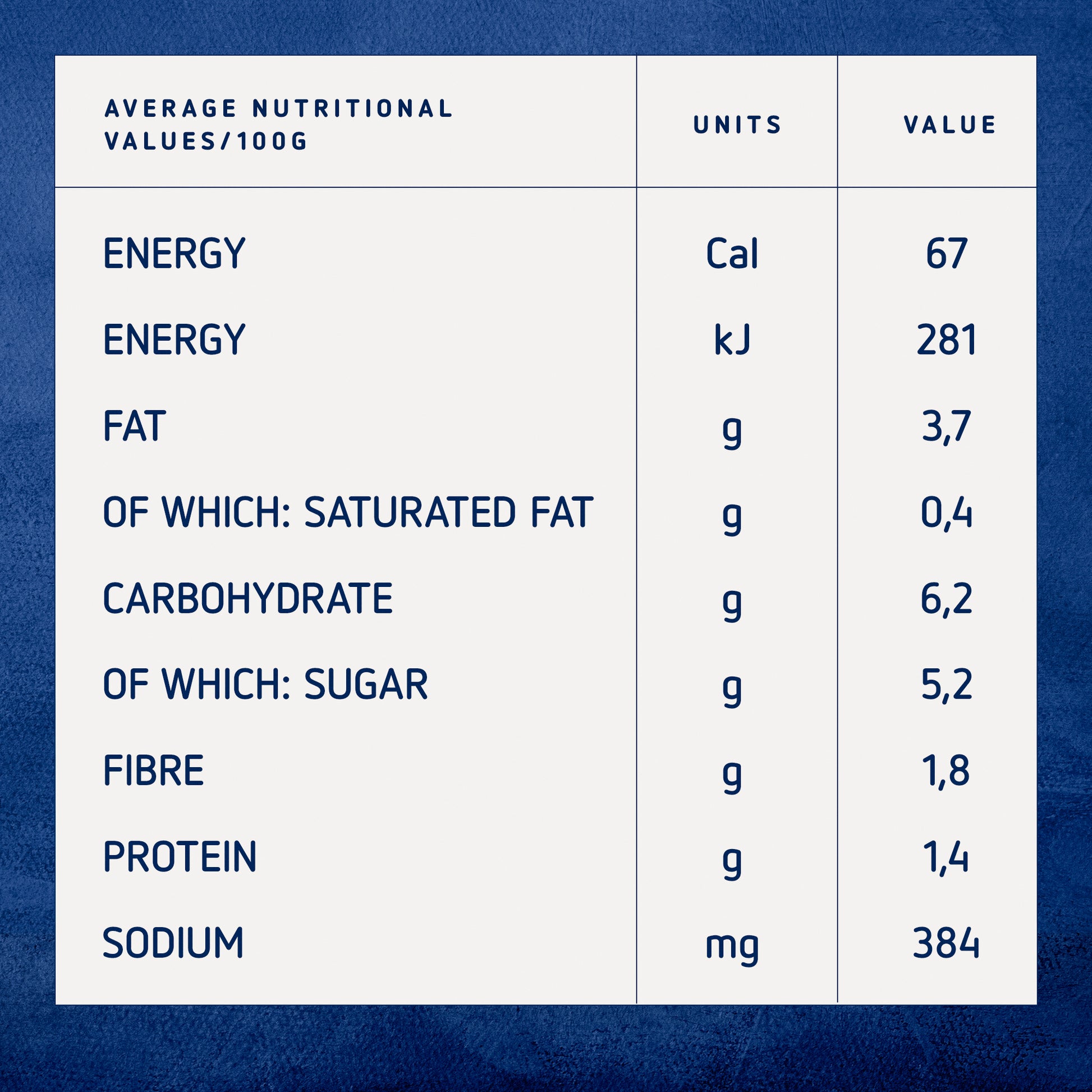 Tomato Pulp 66%, Tomato Concentrate 10%, Onions 7%, Water, Carrots 3.5%, Sunflower Oil, Sugar, Salt, Garlic 0.5%, Thyme 0.4%, Chives 0.2%, Parsley 0.2%, Aromas, Black Pepper,