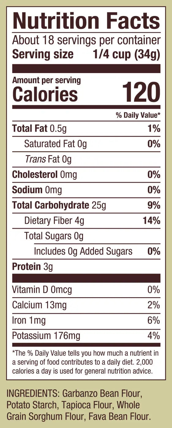 This gluten free flour mix is made with garbanzo bean flour, potato starch, whole grain white sorghum flour, tapioca flour and fava bean flour. It’s a fantastic option for people with celiac disease or a gluten sensitivity. This gluten free flour blend can replace regular all purpose flour in a variety of recipes—just add xanthan gum or guar gum (check the guide on the package).