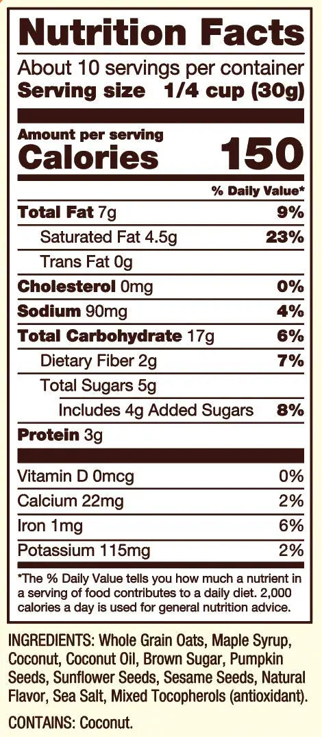 HOMEMADE TASTE: Made with whole grain oats, real maple syrup, coconut and wholesome seeds, it's baked in small batches to create granola that tastes like homemade