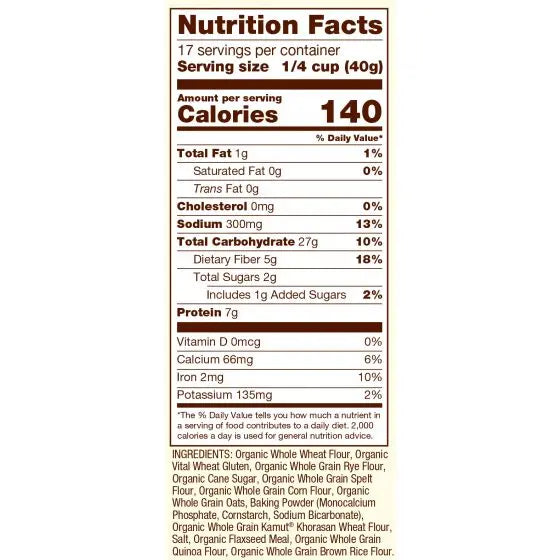 Organic Multigrain Flour Blend (Organic Whole Wheat Pastry Flour, Organic Whole Grain Rye Flour, Organic Whole Grain Spelt Flour, Organic Whole Grain Corn Flour, Organic Whole Grain Oat Flour, Organic Whole Grain Kamut® Khorasan Wheat Flour, Organic Whole Grain Flaxseed Meal, Organic Whole Grain Quinoa Flour, Organic Whole Grain Brown Rice Flour), Organic Vital Wheat Gluten, Organic Cane Sugar, Baking Powder (Monocalcium Phosphate, Sodium Bicarbonate, Cornstarch), Sea Salt.