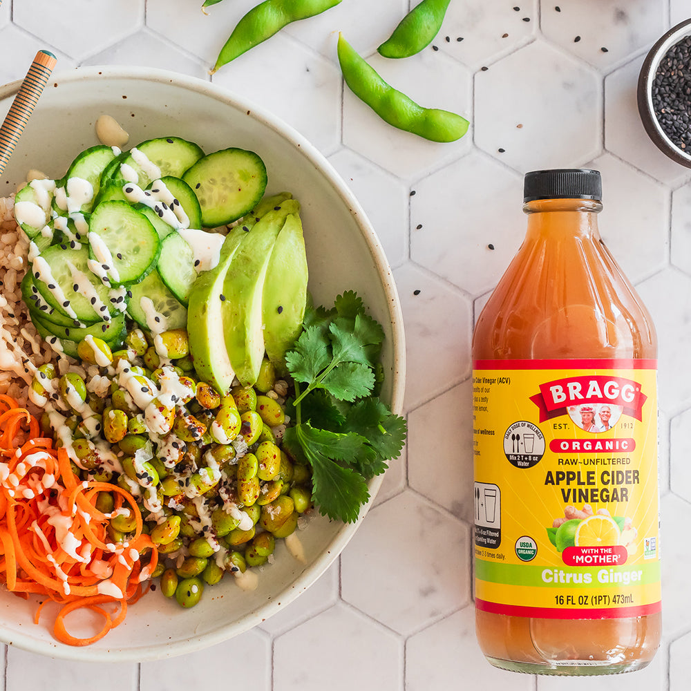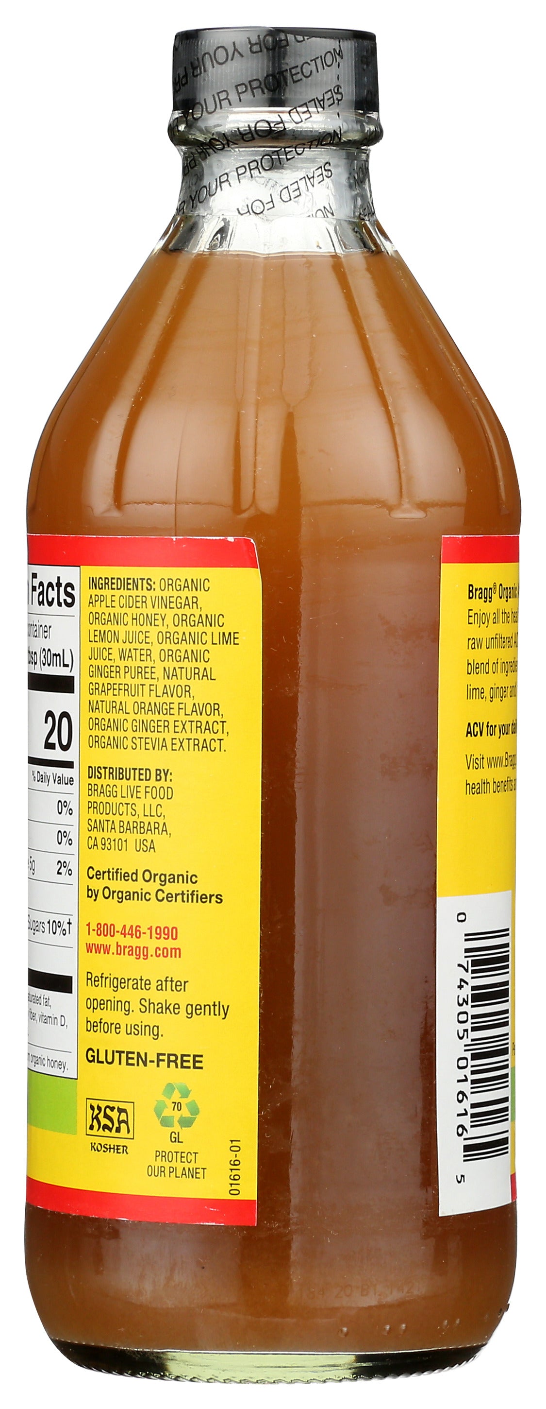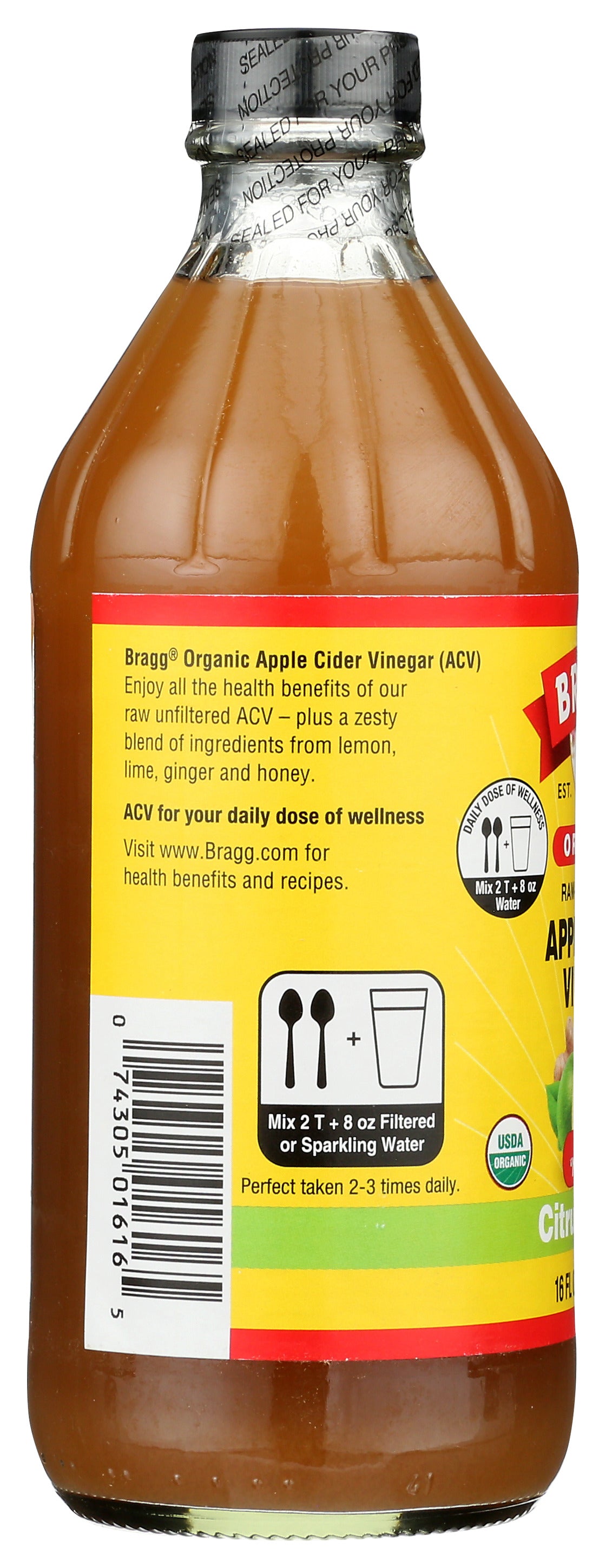 - FEATURE: Bragg Organic Apple Cider Vinegar. Enjoy all the health benefits of our raw unfiltered ACV - plus a zesty blend of ingredients from lemon, lime, ginger and honey