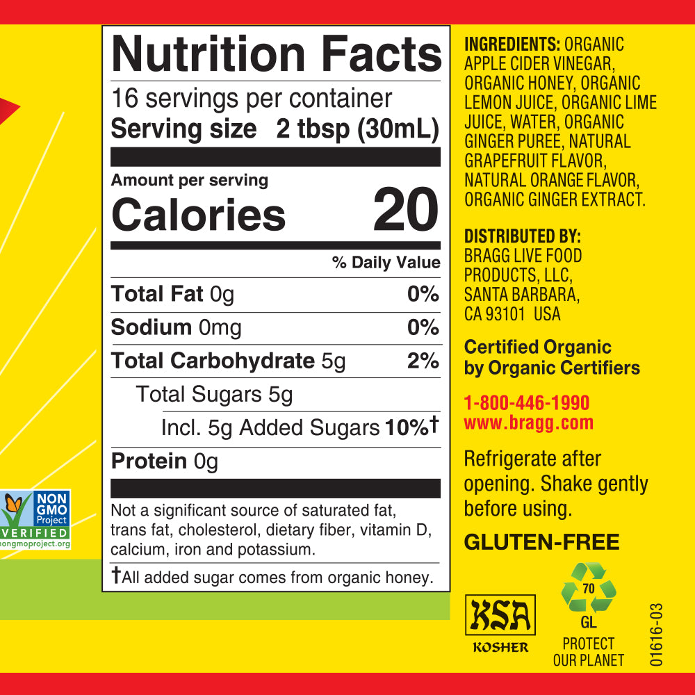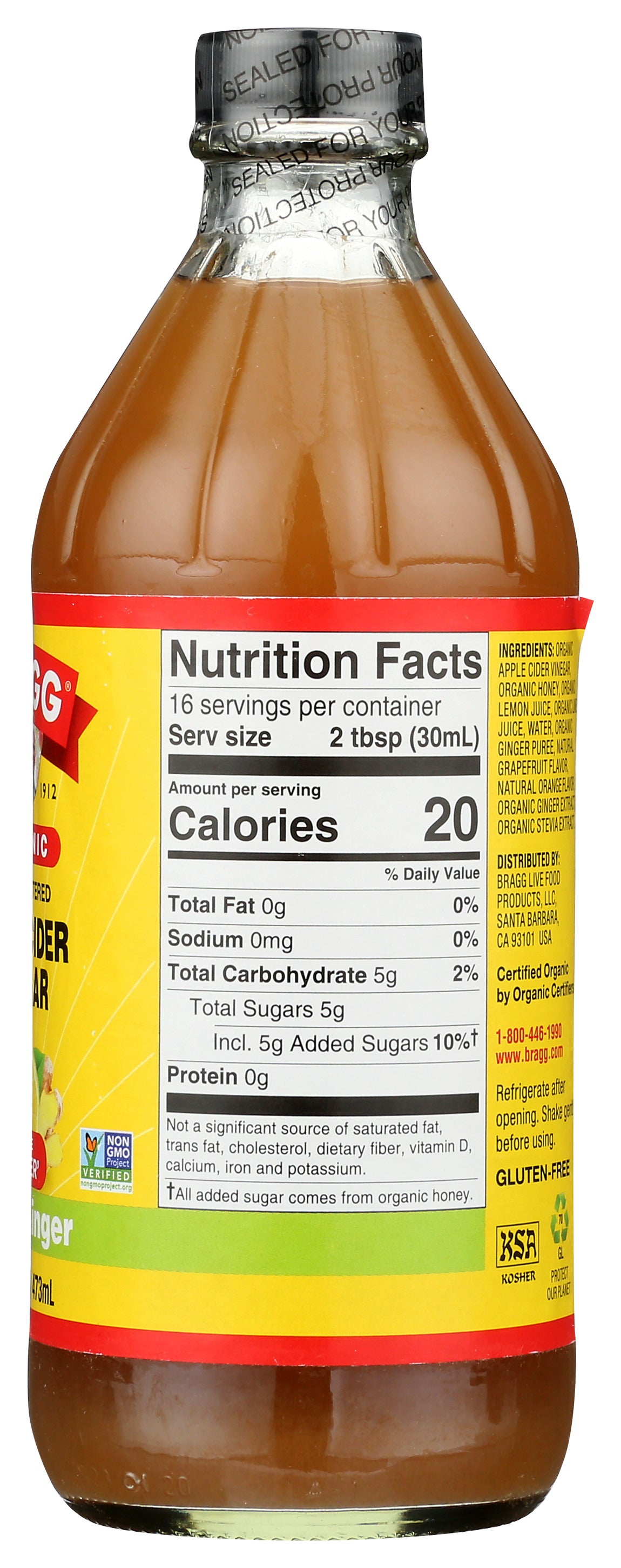 Bragg Organic Apple Cider Vinegar, Raw & Unfiltered, Citrus Ginger - Raw unfiltered ACV - plus a zesty blend of ingredients from lemon, lime, ginger and honey, Organic, Gluten-Free, non-GMO