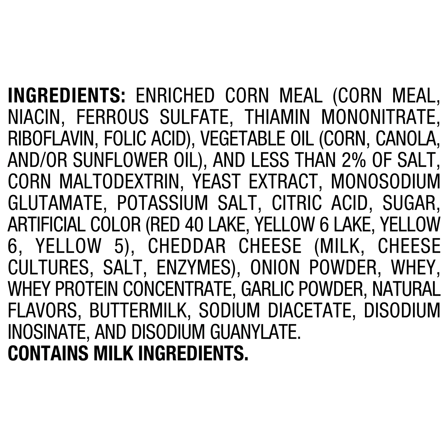 Ingredients :Enriched Corn Meal (Corn Meal, Ferrous Sulfate, Niacin, Thiamin Mononitrate, Riboflavin, Folic Acid), Vegetable Oil (Corn, Canola, and/or Sunflower Oil), Flamin' Hot Seasoning (Maltodextrin [Made from Corn], Salt, Sugar, Monosodium Glutamate, Yeast Extract, Citric Acid, Artificial Color [Red 40 Lake, Yellow 6 Lake, Yellow 6, Yellow 5], Sunflower Oil, Cheddar Cheese [Milk, Cheese Cultures, Salt, Enzymes], Onion Powder, Whey, Whey Protein Concentrate, Garlic Powder, Natural Flavor, Buttermilk, Sodium Diacetate, Disodium Inosinate, Disodium Guanylate), and Salt.