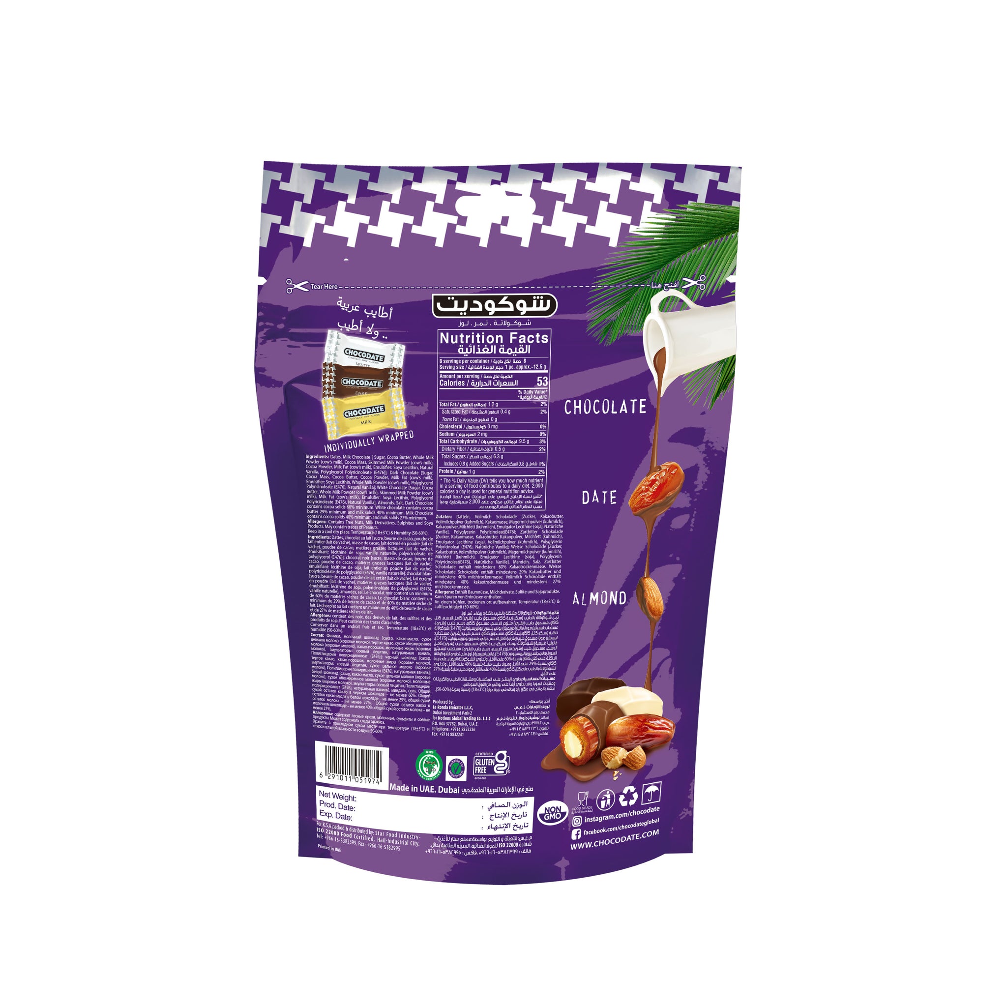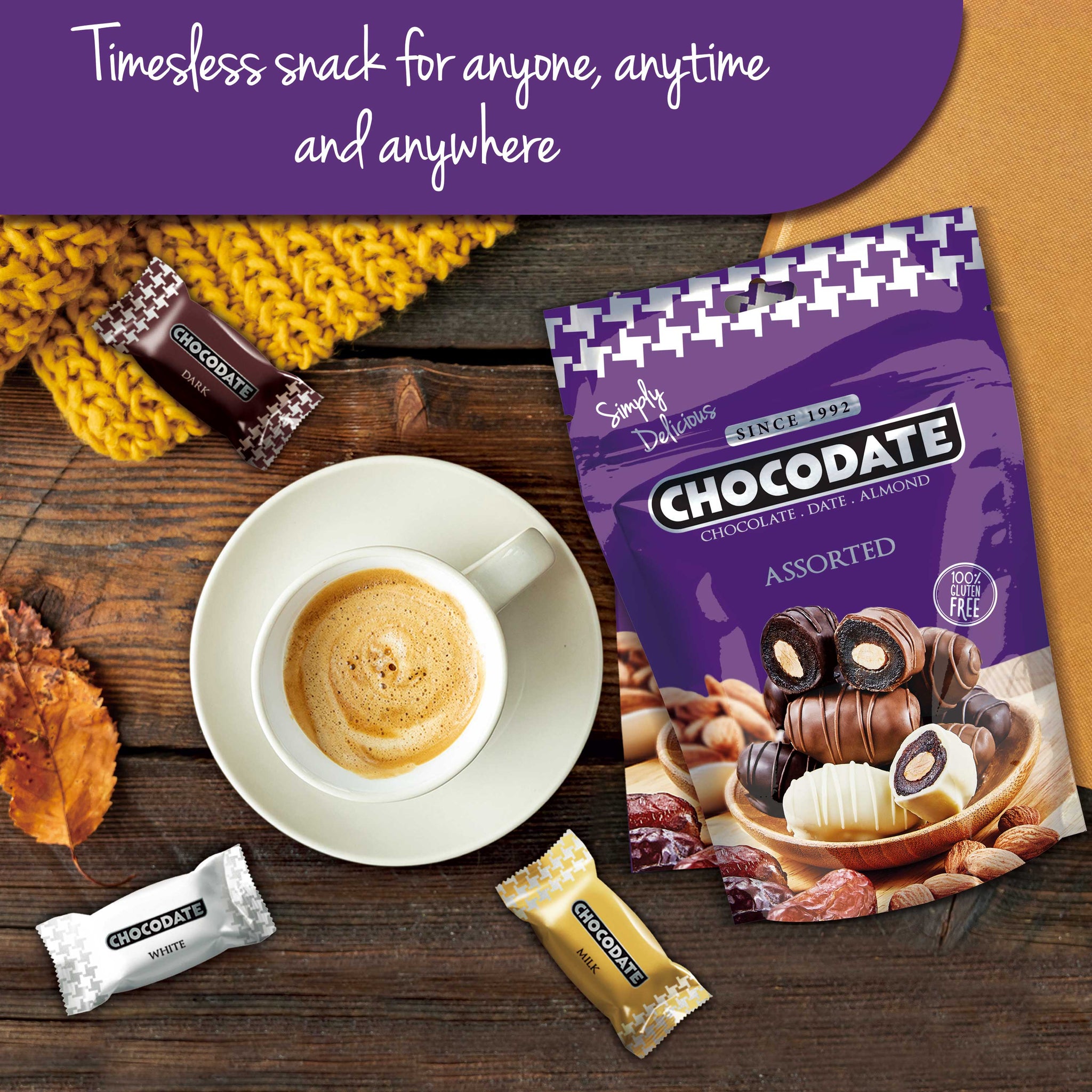 - Product Specifications: Chocodate almond-date treats are available in assorted combination of Dark, Milk & White in a snack size treat pack of 33 gm and should be stored in cool, dark places.