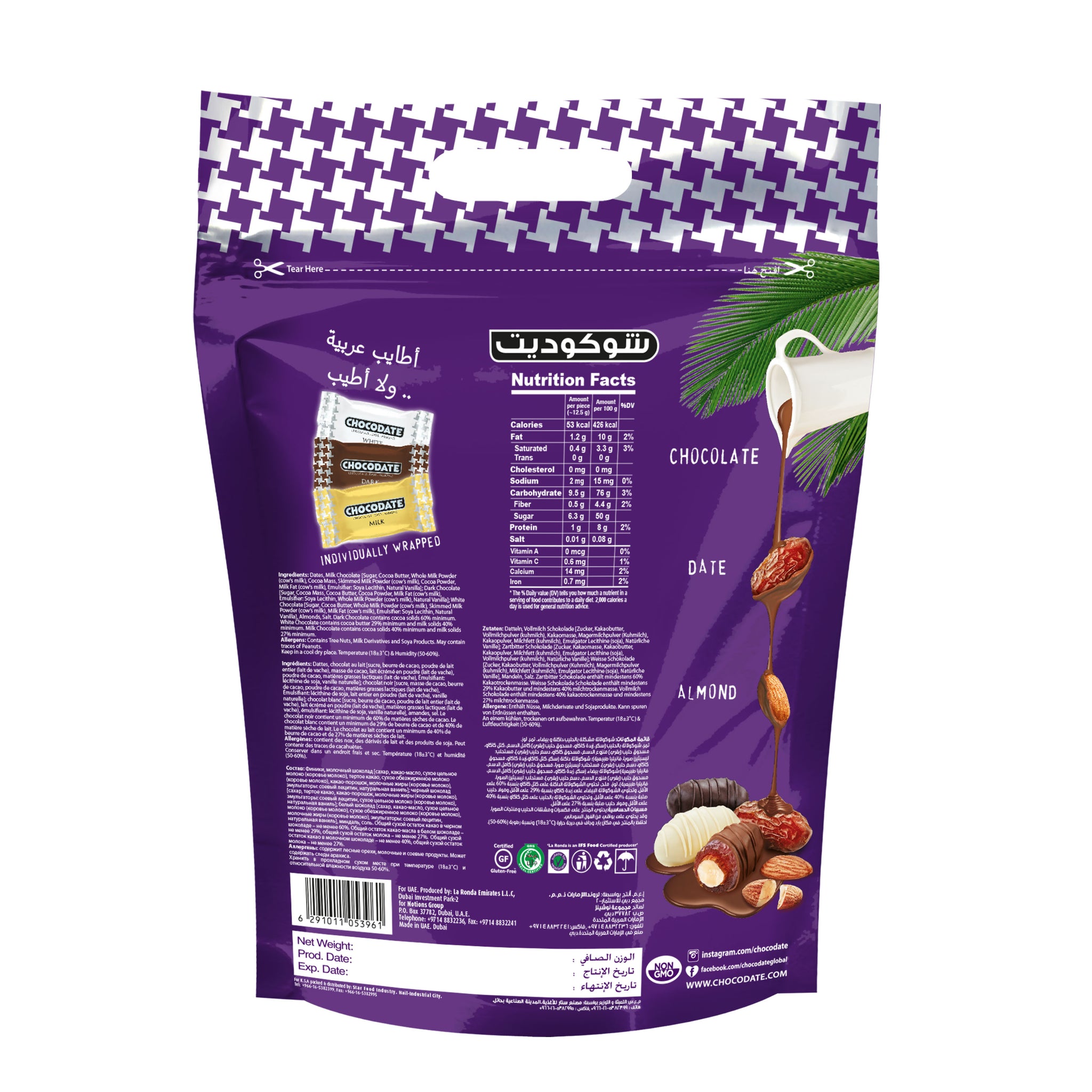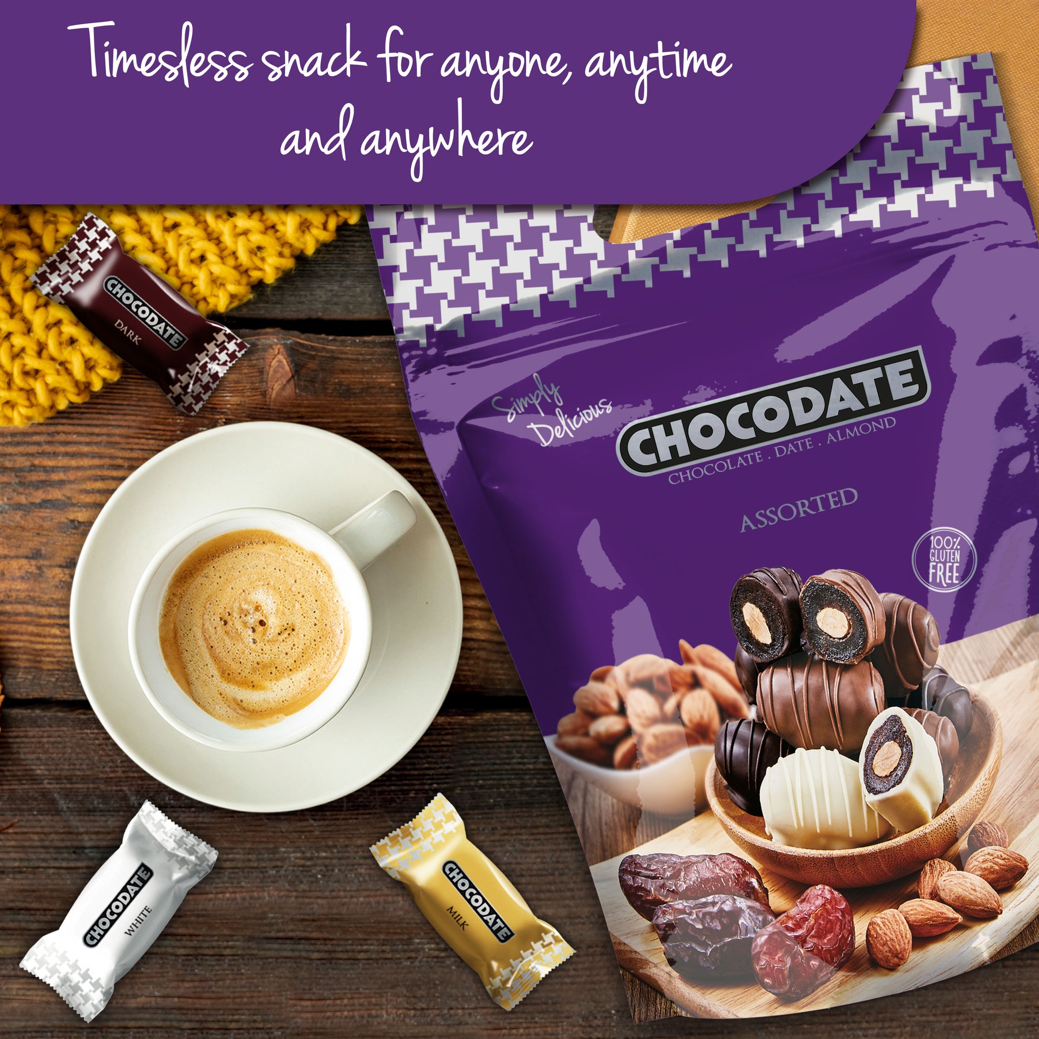 • Product Specifications: Chocodate almond-date treats are available in assorted combination of Dark, Milk & White in a snack size treat pack of 33 gm and should be stored in cool, dark places.