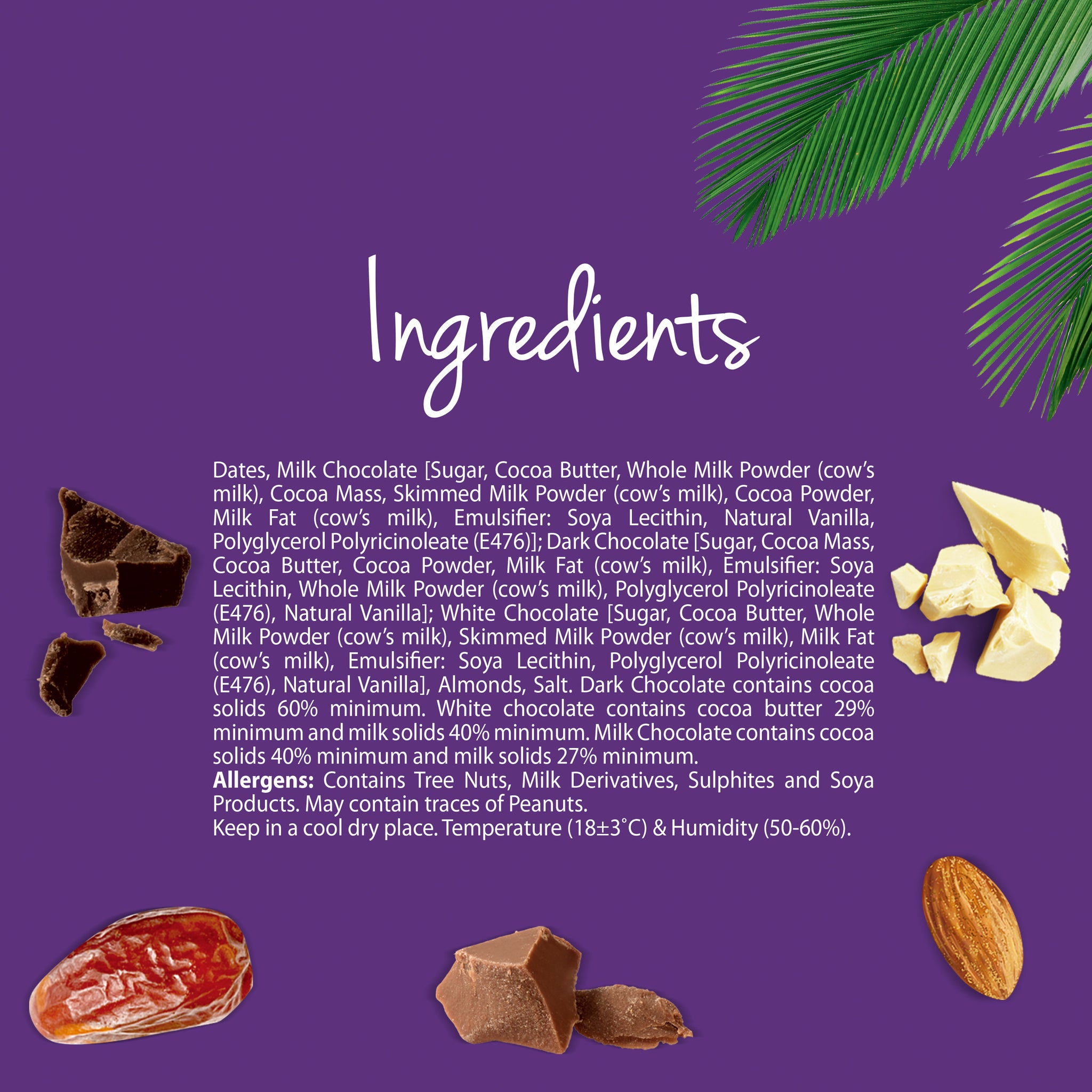 Dates, Milk Chocolate [ Sugar, Cocoa Butter, Whole Milk Powder (cow’s milk), Cocoa Mass, Skimmed Milk Powder (cow’s milk), Cocoa Powder, Milk Fat(cow’s milk), Emulsifier: Soya Lecithin, Natural vanilla, Polyglycerol polyricinoleate (E476)]; Dark Chocolate [Sugar, Cocoa Mass, Cocoa Butter, Cocoa Powder, Milk Fat (Cow’s milk), Emulsifier: Soya Lecithin, Whole Milk Powder (Cow’s milk), Polyglycerol polyricinoleate (E476), Natural vanilla]; White Chocolate[Sugar, Cocoa Butter, Whole Milk Powder (cow’s milk), Skimmed Milk Powder (cow’s milk), Milk Fat(cow’s milk), Emulsifier: Soya Lecithin, Polyglycerol polyricinoleate (E476),Natural Vanilla],Almonds ,Salt Dark chocolate contains cocoa solids 60% minimum. White chocolate contains cocoa butter 29% minimum and Milk solids 40% minimum. Milk chocolate contains cocoa solids 40% minimum and milk solids 27% minimum. Allergens: Contains Tree nuts, Milk derivatives and Soya products. May contain traces of Peanuts. Keep in a Cool dry place. Temperature (18±3OC) & Humidity (50-60%).
