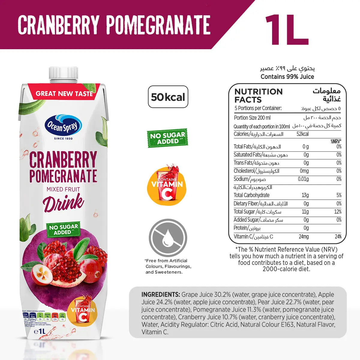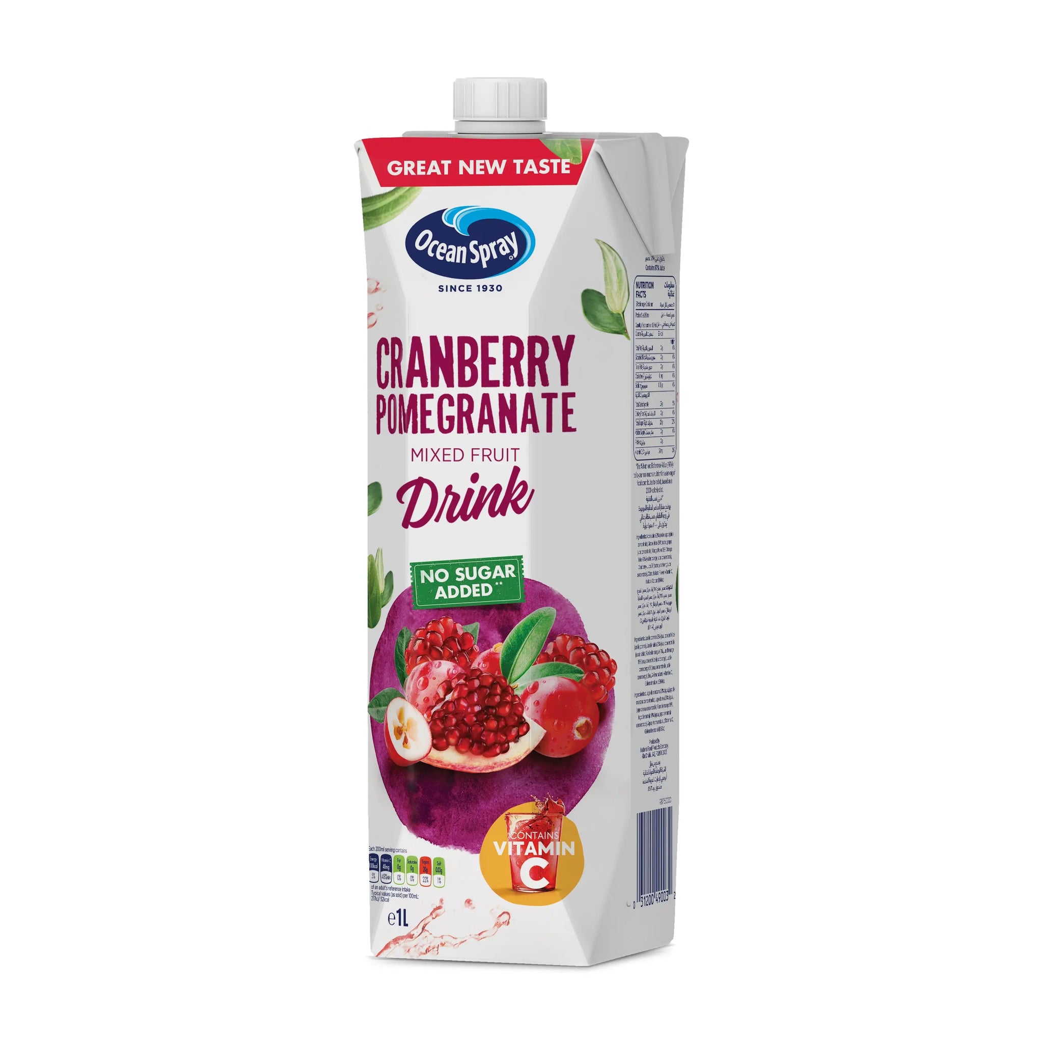 Ocean Spray Cranberry Pomegranate Mixed Fruit Drink No Sugar Added, 1 Litre, Contains Vitamin C.