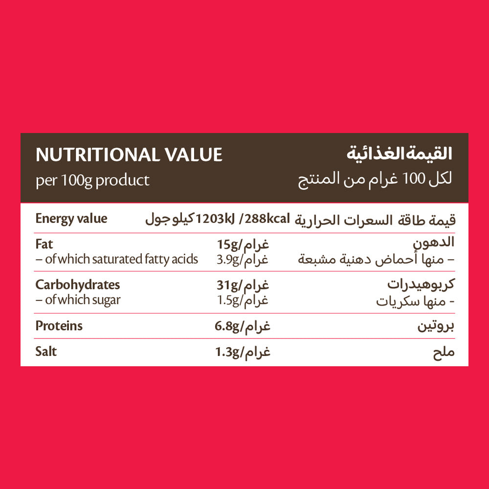 Wheat flour, water, refined oils (palm oil, rapseed oil, cottonseed oil and sunflower oil) in varying proportions; cornstarch, salt, olive oil (1.3%), sugar, flour treatment agent: L-cysteine, ascorbic acid; enzymes; coloring agent: carotenes flavors; butter flavoring. Filling: cheese curd (36%) [pasteurized whey], water, cow's milk white brined cheese (15%) [pasteurized cow's milk, salt, lactic culture, firming agent: calcium chloride; microbial rennet], feta cheese (10%) [pasteurized sheep's milk, pasteurized goat's milk, salt lactic culture, microbial rennet wheat semolina, emulsifier; cellulose, sodium carbxymethylcellulose, milk protein, margarine (refined sunflower oil, re-esterified palm oil, water, refined palm oil, salt, emulsifiers: mono- and diglycerides of fatty acids, soy lecithin preservative potassium sorbate; acidity regulator: citirc acid; butter flavoring, coloring agent: carotenes; antioxidant: alpha-tocopherol], salt. Olive paste: olive paste , refined sunflower oil.