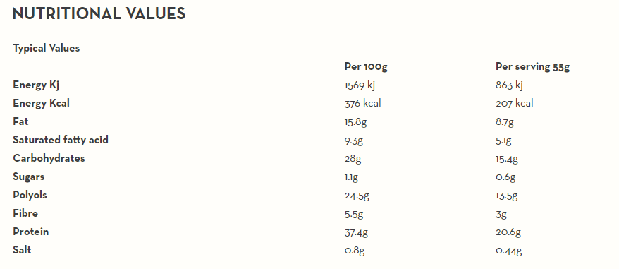 Ingredients: No added sugar dark chocolate with sweetener (28,2%) (cocoa mass, sweetener [maltitol], cocoa butter, milk fat, emulsifier [soya lecithin], flavourings), milk protein, humectant (glycerol), hydrolyzed collagen, caramel flavour layer (10%) (soluble corn fibre, palm fat, sweetener [maltitol], milk protein, cocoa butter, humectant [glycerol], whole milk powder, salt, flavourings, emulsifier [soya lecithin], flavourings), soya crispies (7,3%) (soya protein), soluble corn fibre, palm fat, fat reduced cocoa, flavourings, salt, vitamins (vitamin C, E, B6, B12, thiamin, riboflavin, niacin, pantothenic acid, folic acid), sweetener (sucralose). May contain gluten-containing cereals, eggs, nuts, peanuts and sesame seeds.