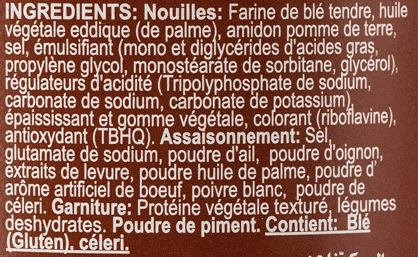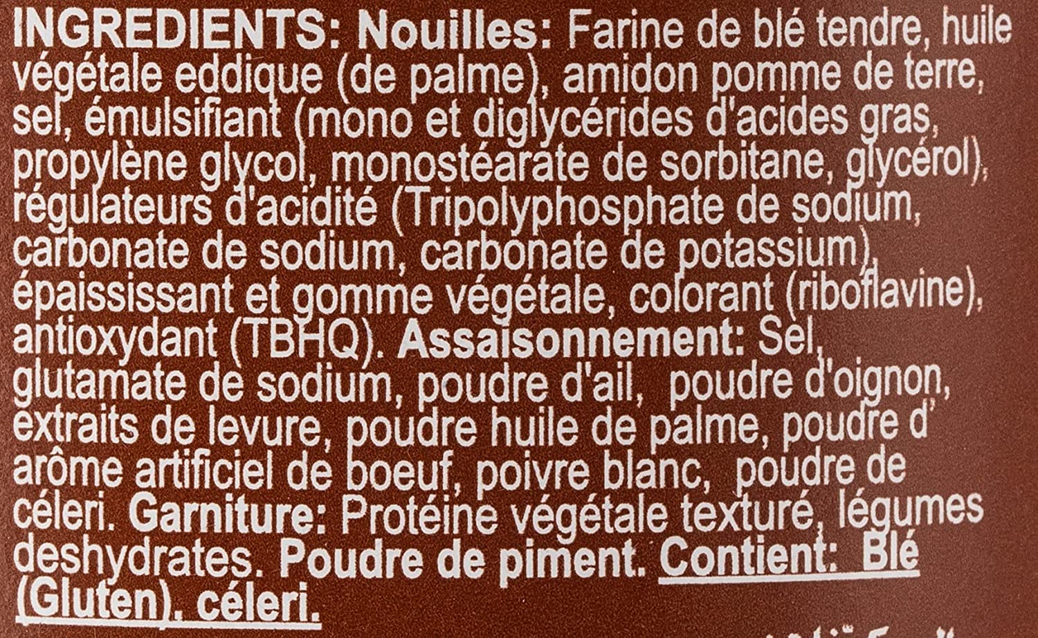 Noodles: Wheat Flour,Vegetable Oil (contains antioxidant E319) ,Salt, Acidity Regulators (E451, E501, E500), Thickener (E412), Colour (E101). Seasoning Powder: Salt, Sugar, Monosodium Glutamate (flavor enhancer E621), Garlic Powder, Artificial Beef Flavour, Onion Powder, Yeast Extract, Pepper Powder, Clove Powder, Ginger Powder. Seasoning Oil: Vegetable Oil (contains antioxidant E319), Onion. Sweet Soy Sauce: Sugar, Water, Salt, Wheat, Soybean, Spices, Sesame Oil. Chili Sauce: Chili, Water, Sugar, Salt, Tapioca Starch, Acidity Regulators (E260, E330), Garlic, Flavor Enhancer (E621), Preservative (E202). Vegetable Flakes: Dried Cabbage, Dried Carrot, Dried Spring Onion .