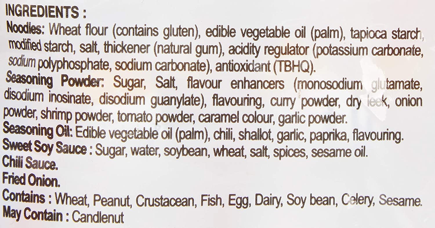 Noodles: Wheat Flour, Vegetable Oil (contains antioxidant E319) ,Salt, Acidity Regulators (E451, E501, E500), Thickener (E412), Colour (E101). Seasoning Powder: Salt, Sugar, Monosodium Glutamate (flavor enhancer E621), Garlic Powder, Artificial Chicken Flavour, Onion Powder, Turmeric Powder, White Pepper Powder, Clove Powder, Nutmeg Powder, Curry Powder, Lime Powder. Seasoning Oil: Vegetable Oil (contains antioxidant E319), Onion. Sweet Soy Sauce: Sugar, Water, Salt, Wheat, Soybean, Spices, Sesame Oil. Chili Sauce: Chili, Water, Sugar, Salt, Tapioca Starch, Acidity Regulators (E260, E330), Garlic, Flavor Enhancer (E621), Preservative (E202). Vegetable Flakes: Dried Cabbage, Dried Carrot, Dried Spring Onion .