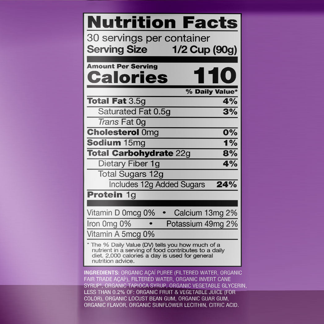 Organic fair trade Açaí puree*, filtered water, organic cane syrup, organic tapioca syrup, less than 0.5% of: organic locust bean gum, organic guar gum, organic flavor, organic sunflower lecithin, citric acid, fruit & vegetable juice (for color).