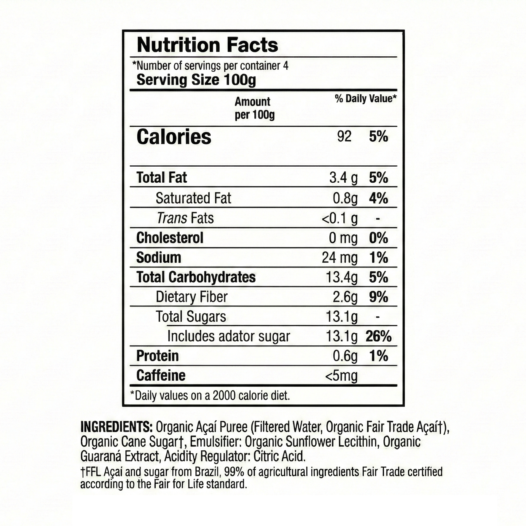 Organic fair trade açaí puree*, organic cane sugar, less than 0.5% of: organic sunflower lecithin, organic guaraná extract, citric acid.