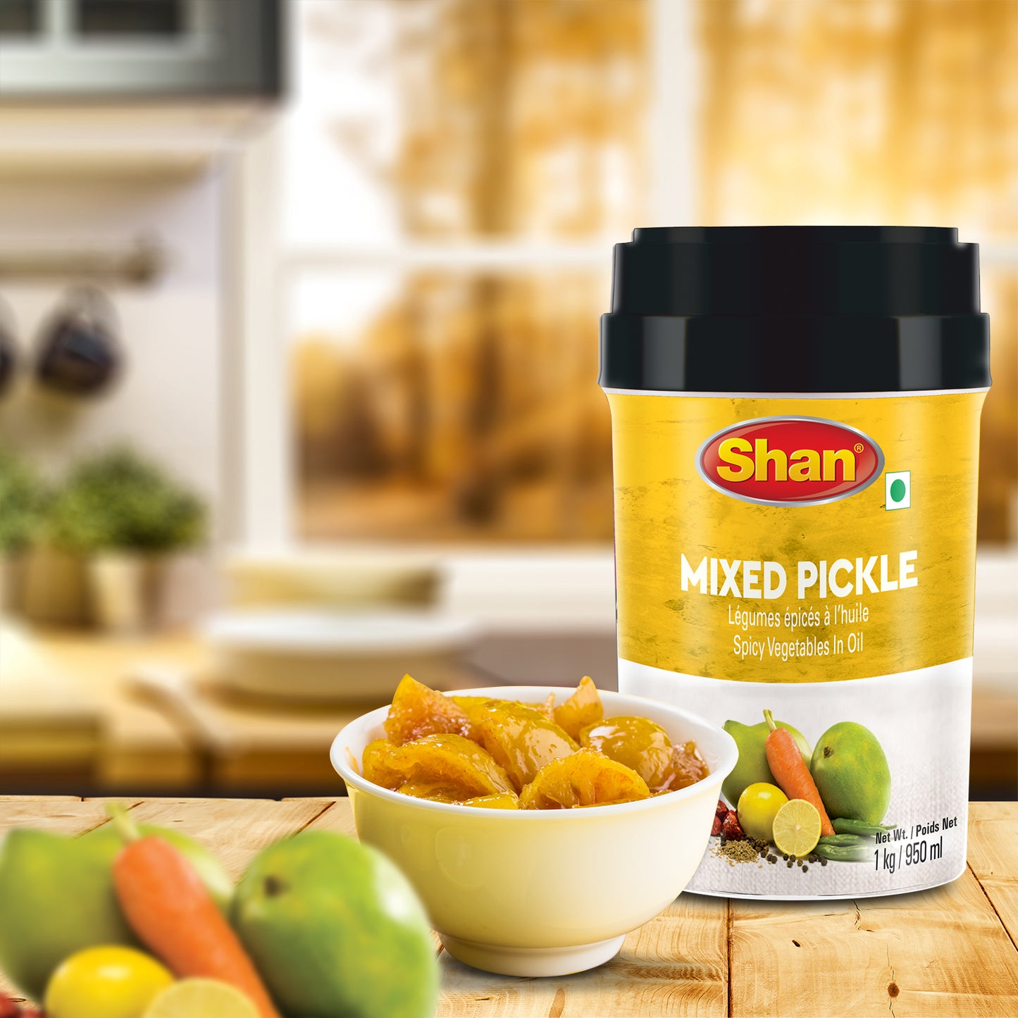 Shan Mixed Pickle 1kg - A generous jar of Shan's 1000g Mixed Pickle for a burst of flavors.