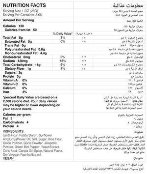 Lentil Flour, Potato Starch, Sunflower And/or Safflower Oil, Cane Sugar, Rice Flour, Sea Salt, Potassium Chloride Salt, Onion Powder, Garlic Powder, Dehydrated Jalapeno, Dehydrated Green Bell Pepper, Yeast Extract, Citric Acid, Turmeric, Canola Oil, Red Pepper, Natural Flavor, Vinegar Powder (Maltodextrin, Vinegar), Paprika Extract.