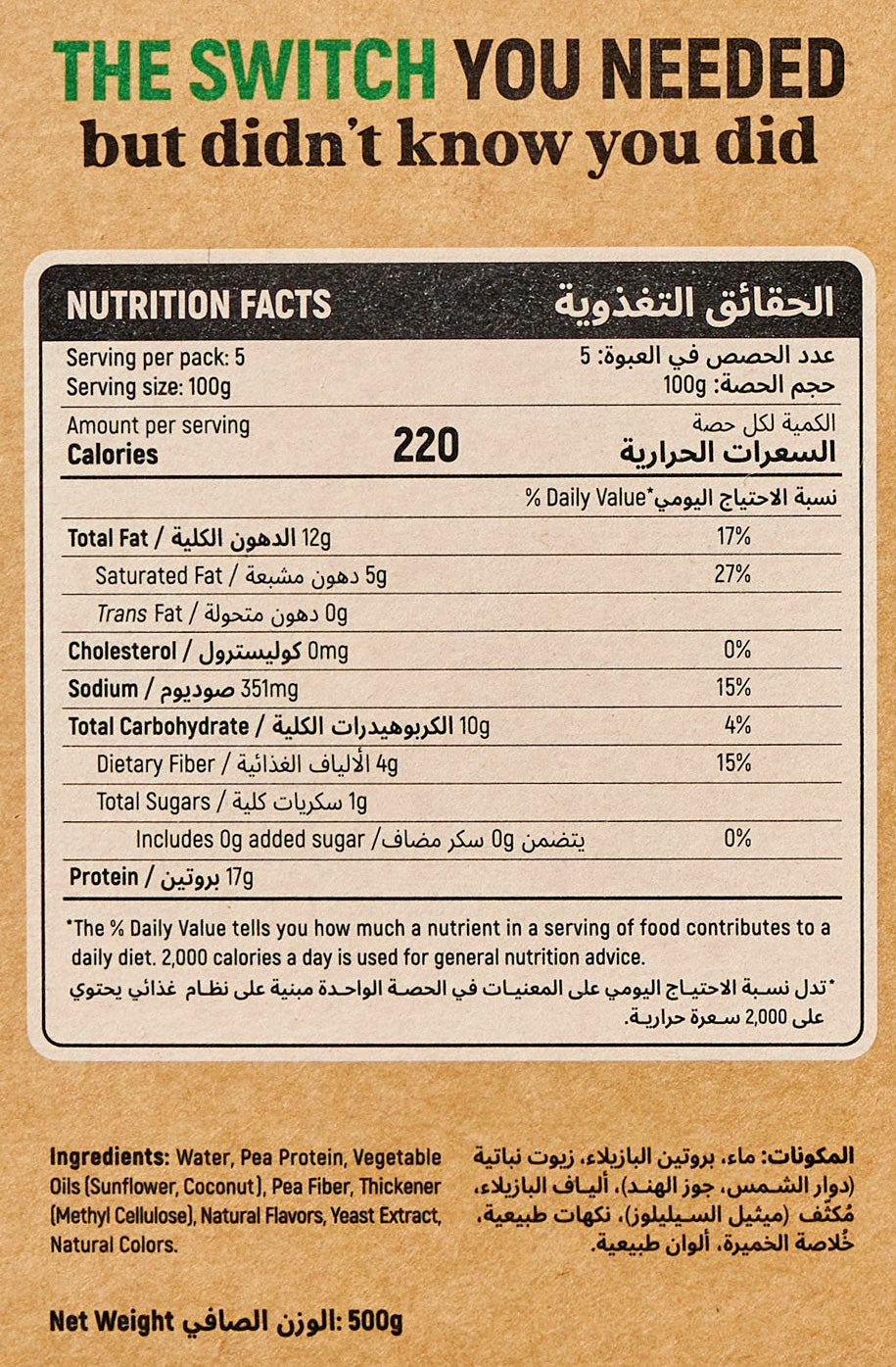 Water, Pea Protein, Vegetable Oils (Sunflower, Coconut), Pea Fiber, Thickener (Methyl Cellulose), Natural Flavors, Yeast Extract, Natural Colors.